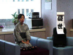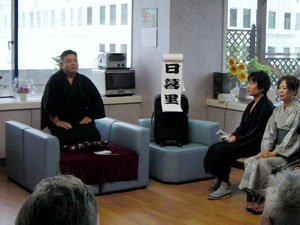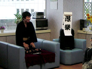 緩和ケア病棟のロビーにちょっと低めの高座が作られまして、患者さんやスタッフのみなさん、合わせて15名ほどの方が集まってくださいました。