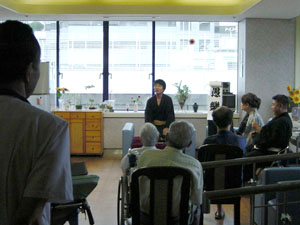 緩和ケア病棟のロビーにちょっと低めの高座が作られまして、患者さんやスタッフのみなさん、合わせて15名ほどの方が集まってくださいました。